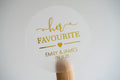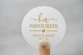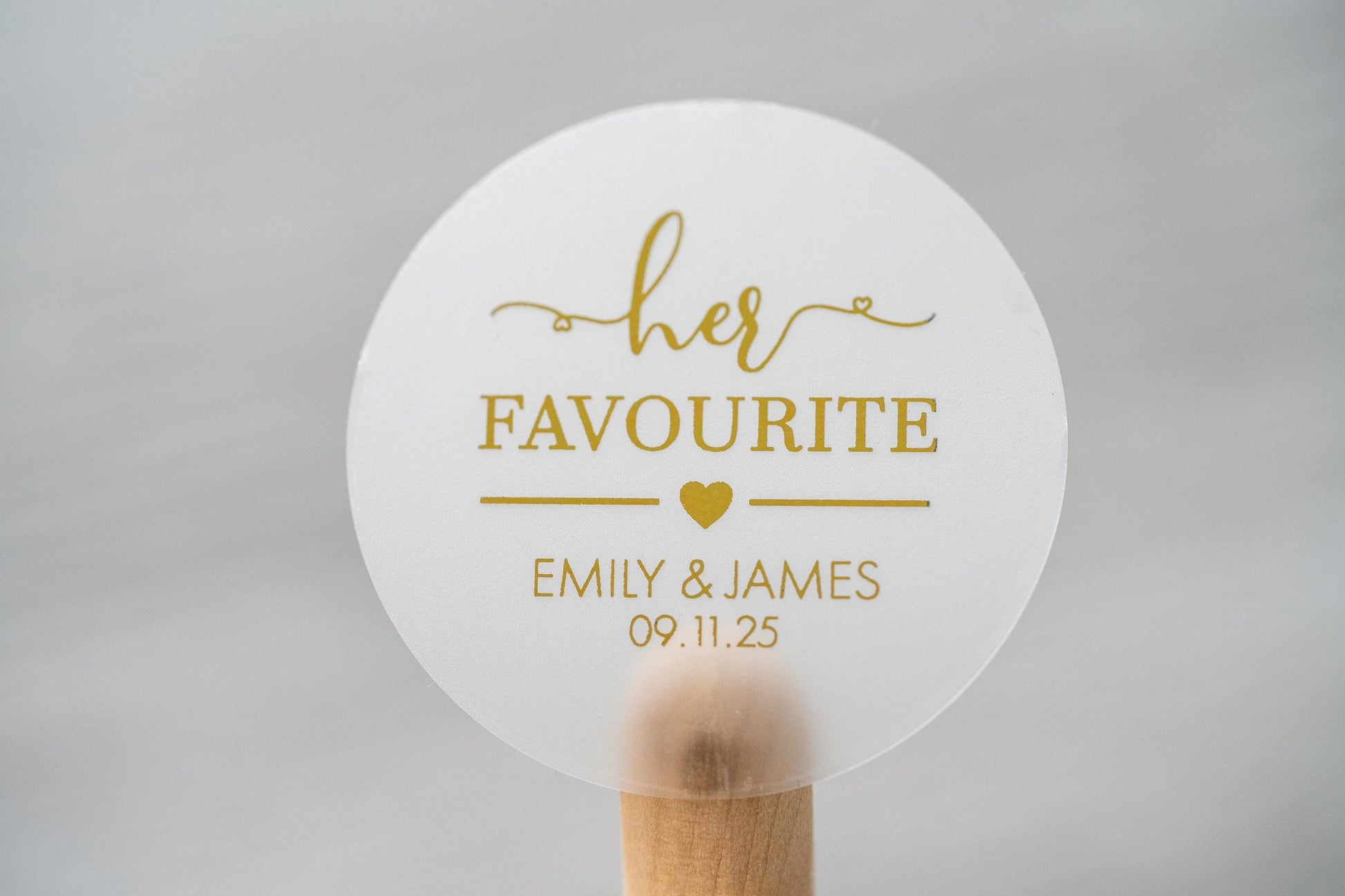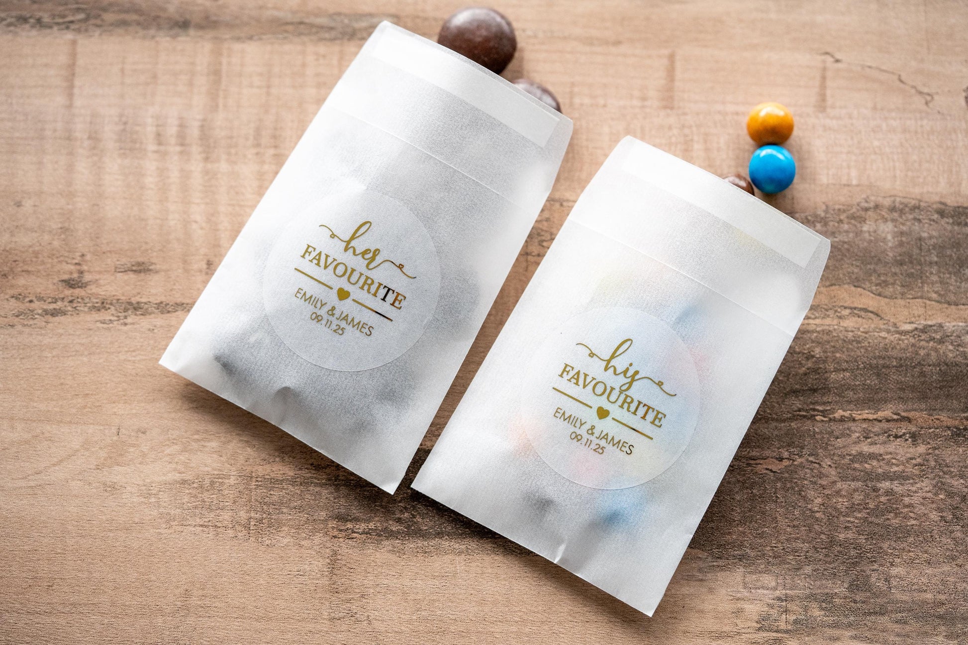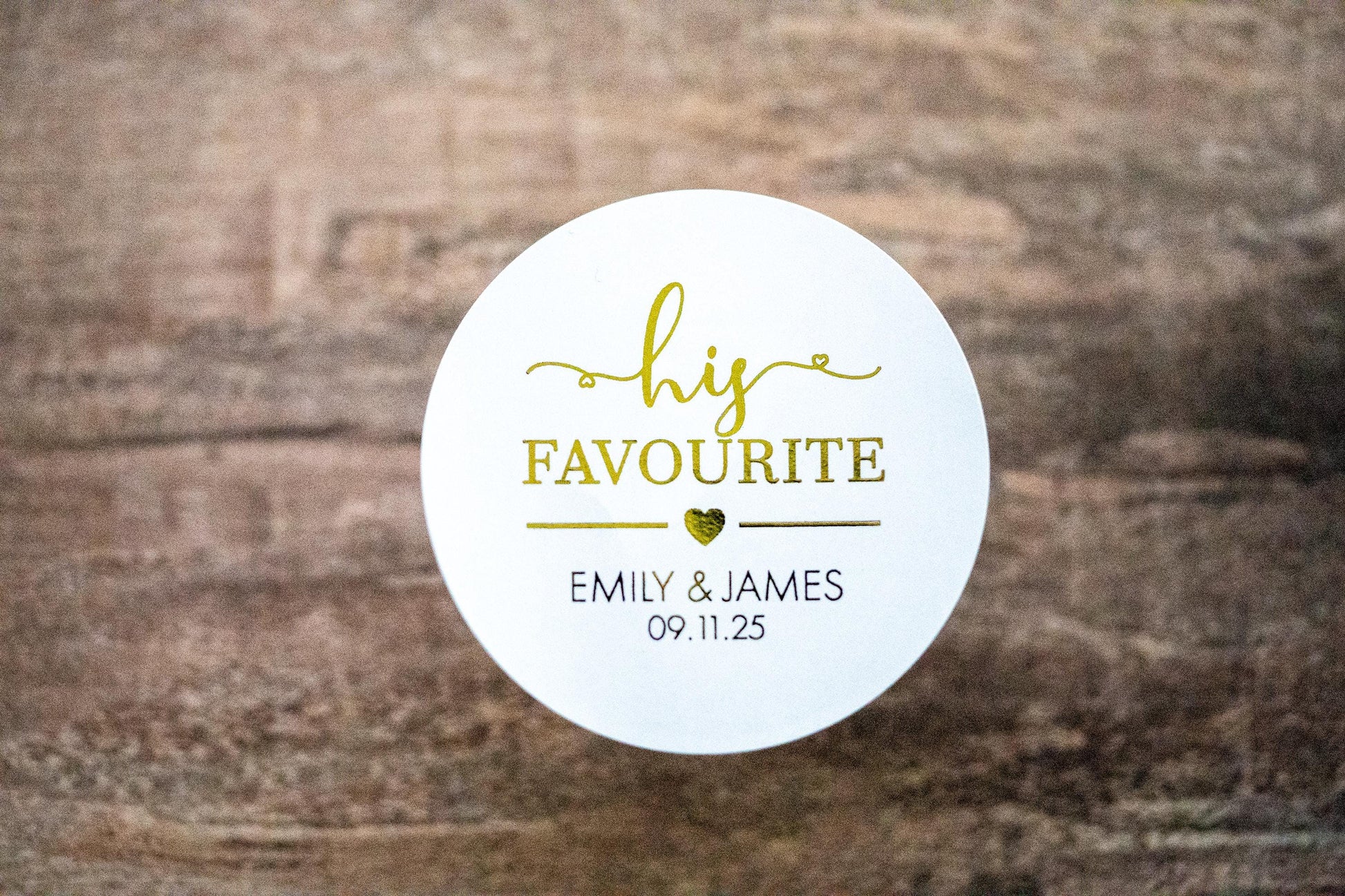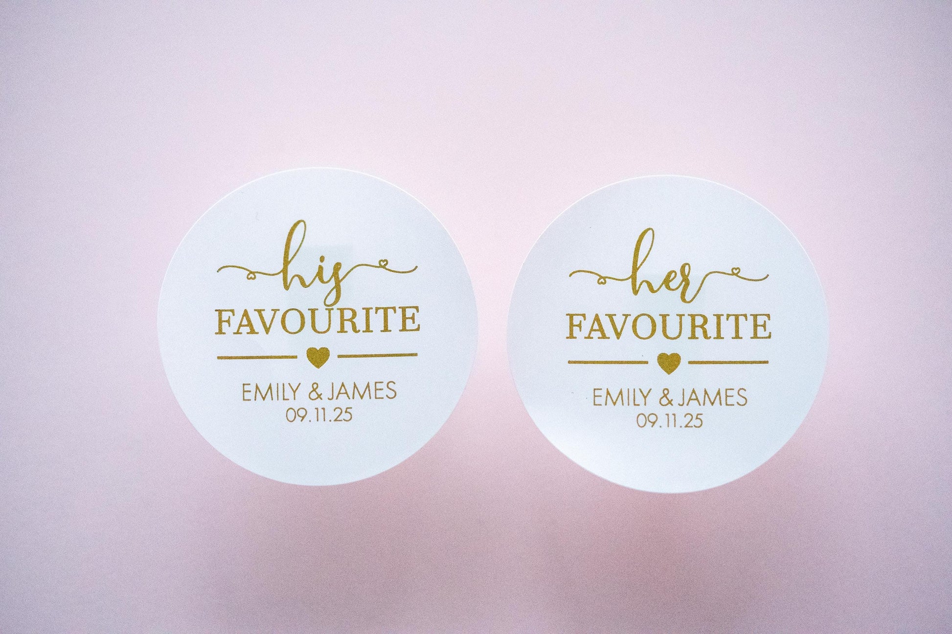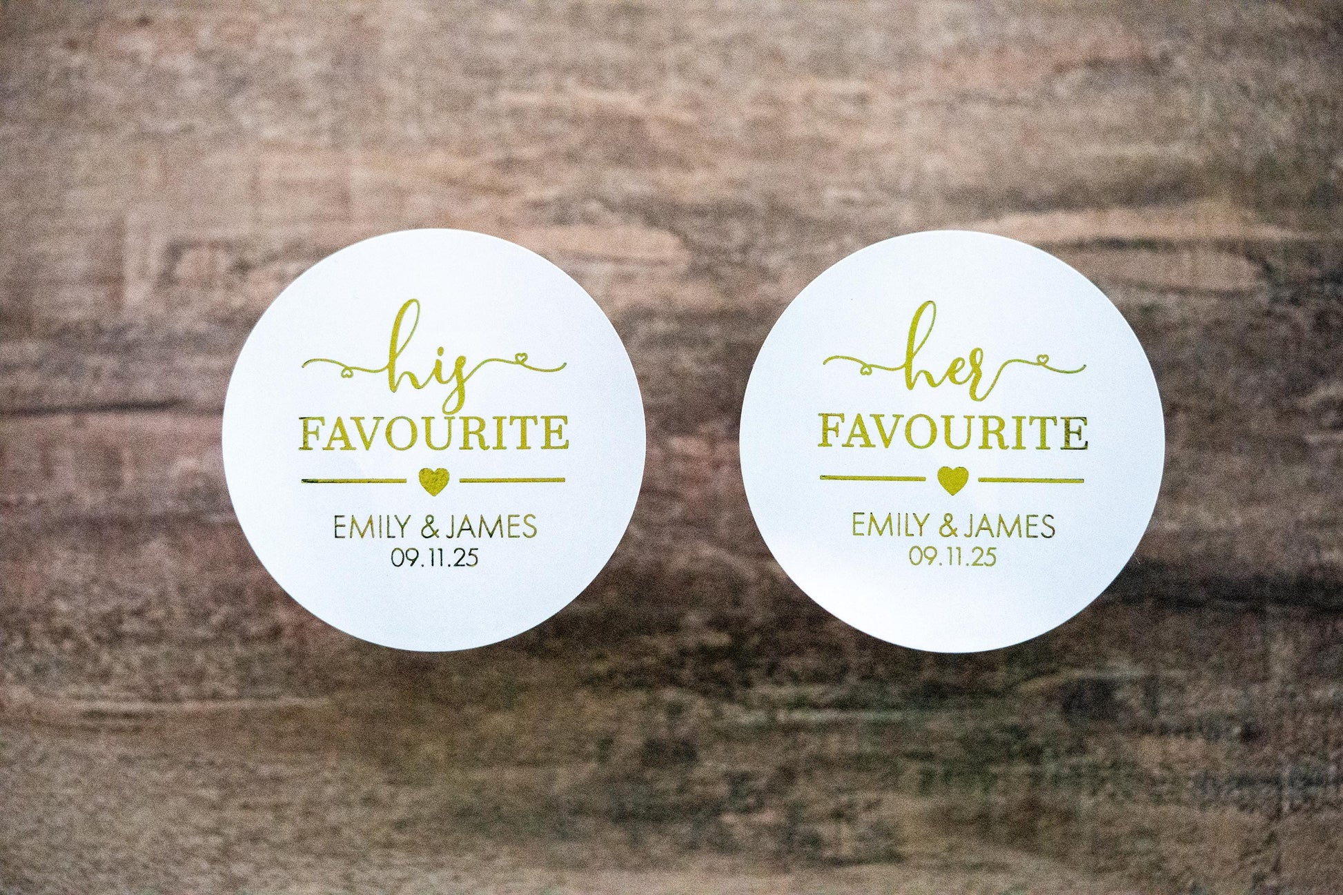 Make your big day even more special with these Personalised Favour Wedding Stickers! Perfect for decorating favours, these customisable stickers feature a luxurious foil finish, adding a touch of elegance to your wedding party. These high-quality stickers can be customised with your names making them perfect for embellishing wedding favours or decorating table settings.