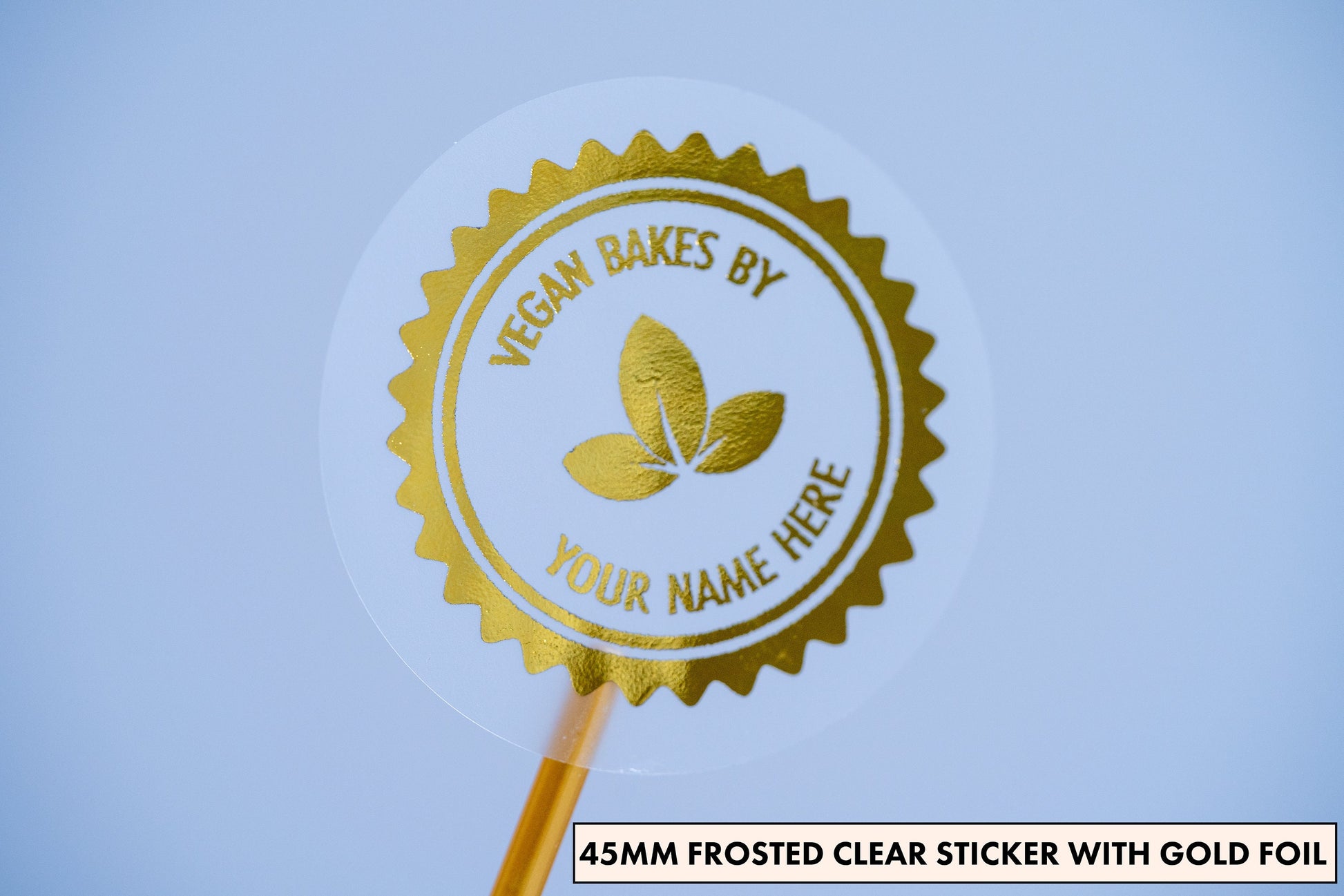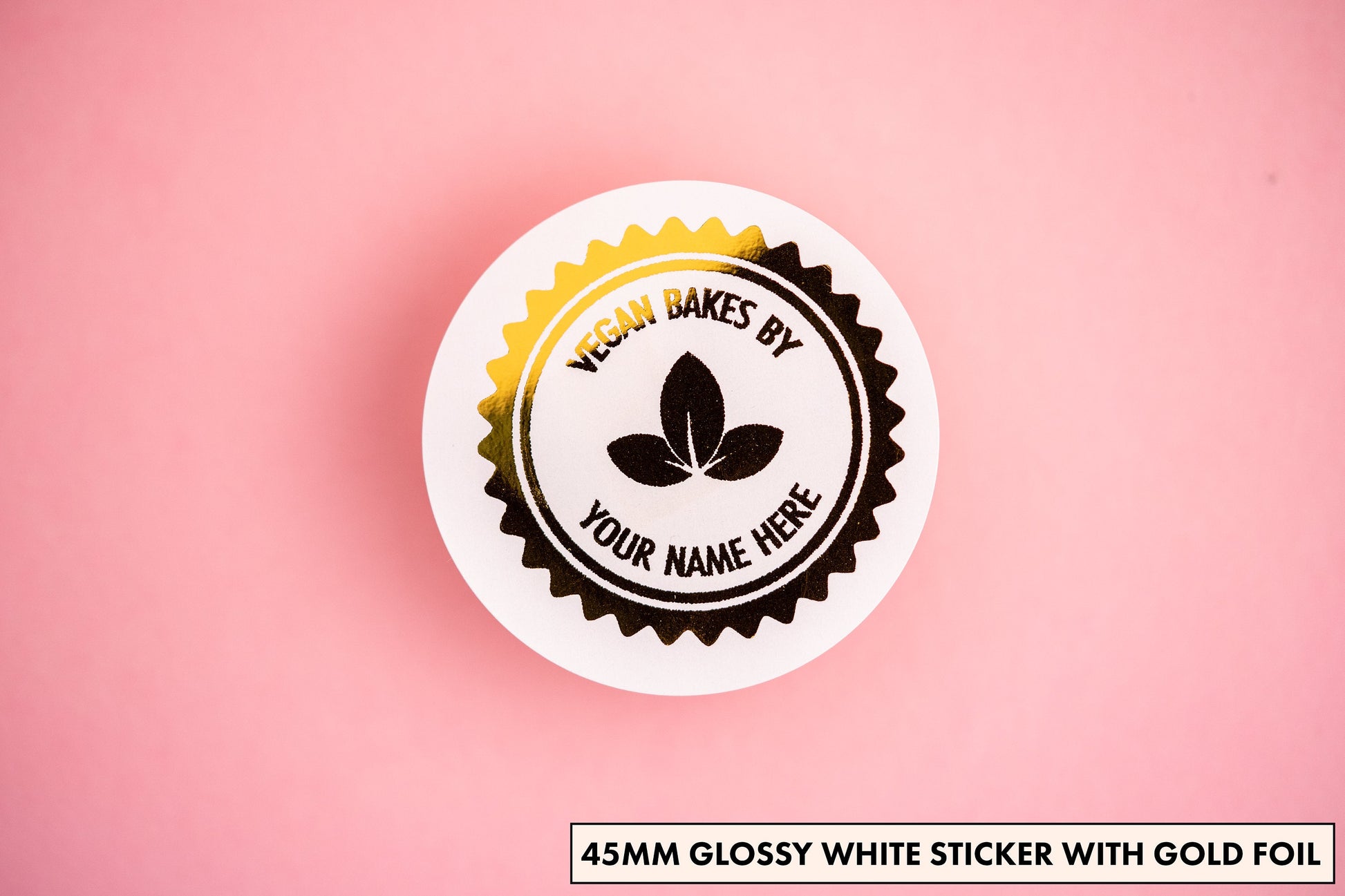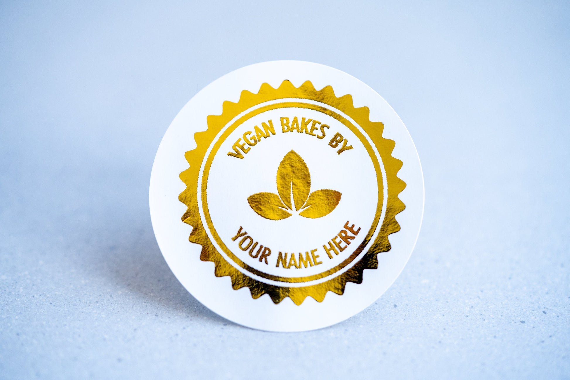 Enhance your bakery creations with these custom "Vegan Bakes By" stickers! Perfect for small businesses and home bakers, these metallic foil stickers add a touch of personalisation to your delicious treats. Simply place them on top of your baked goods for a professional and stylish finish. These stickers are a wonderful way to showcase your hard work and dedication to your craft. Upgrade your packaging and treat your customers or friends to a delightful surprise with these personalised stickers.