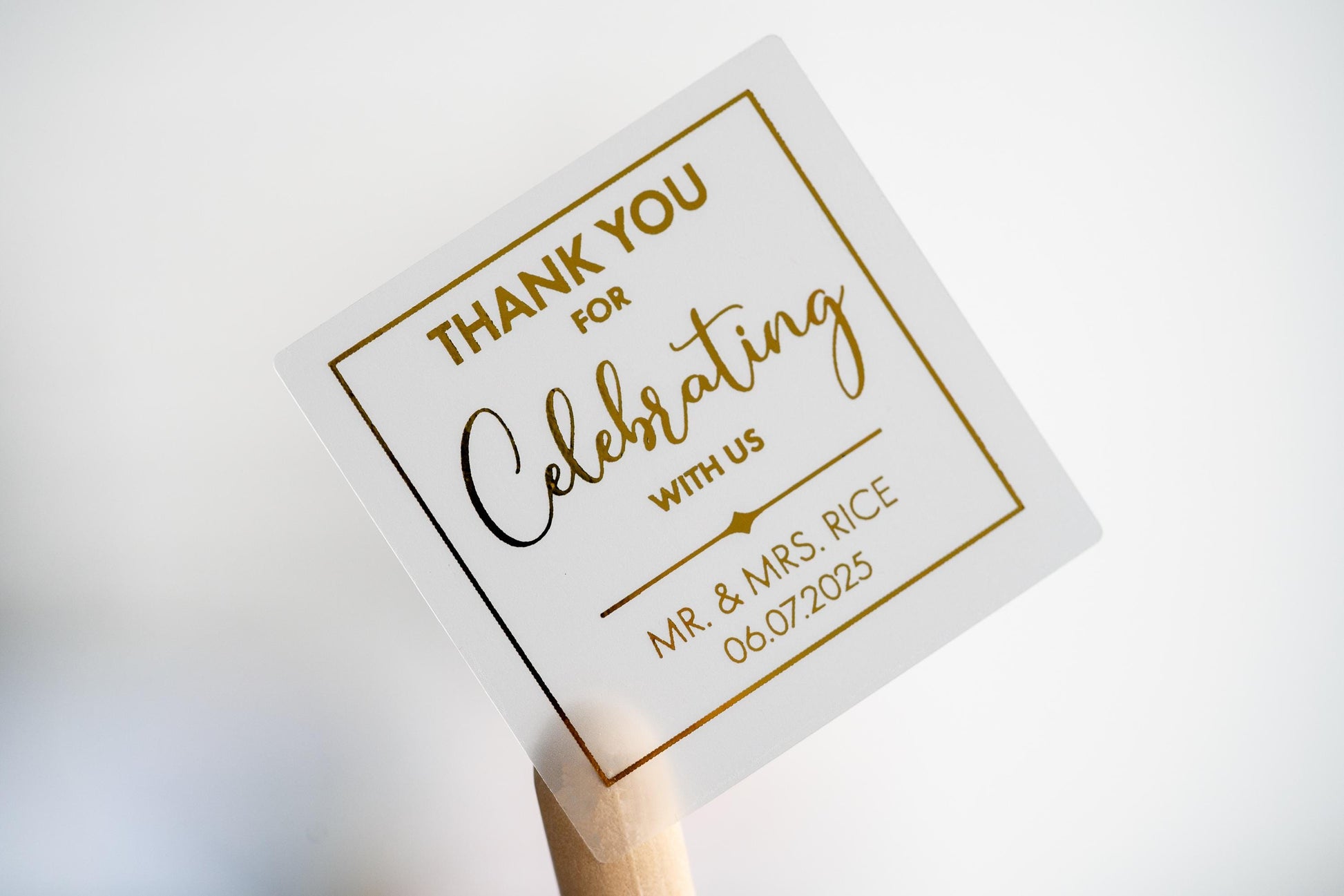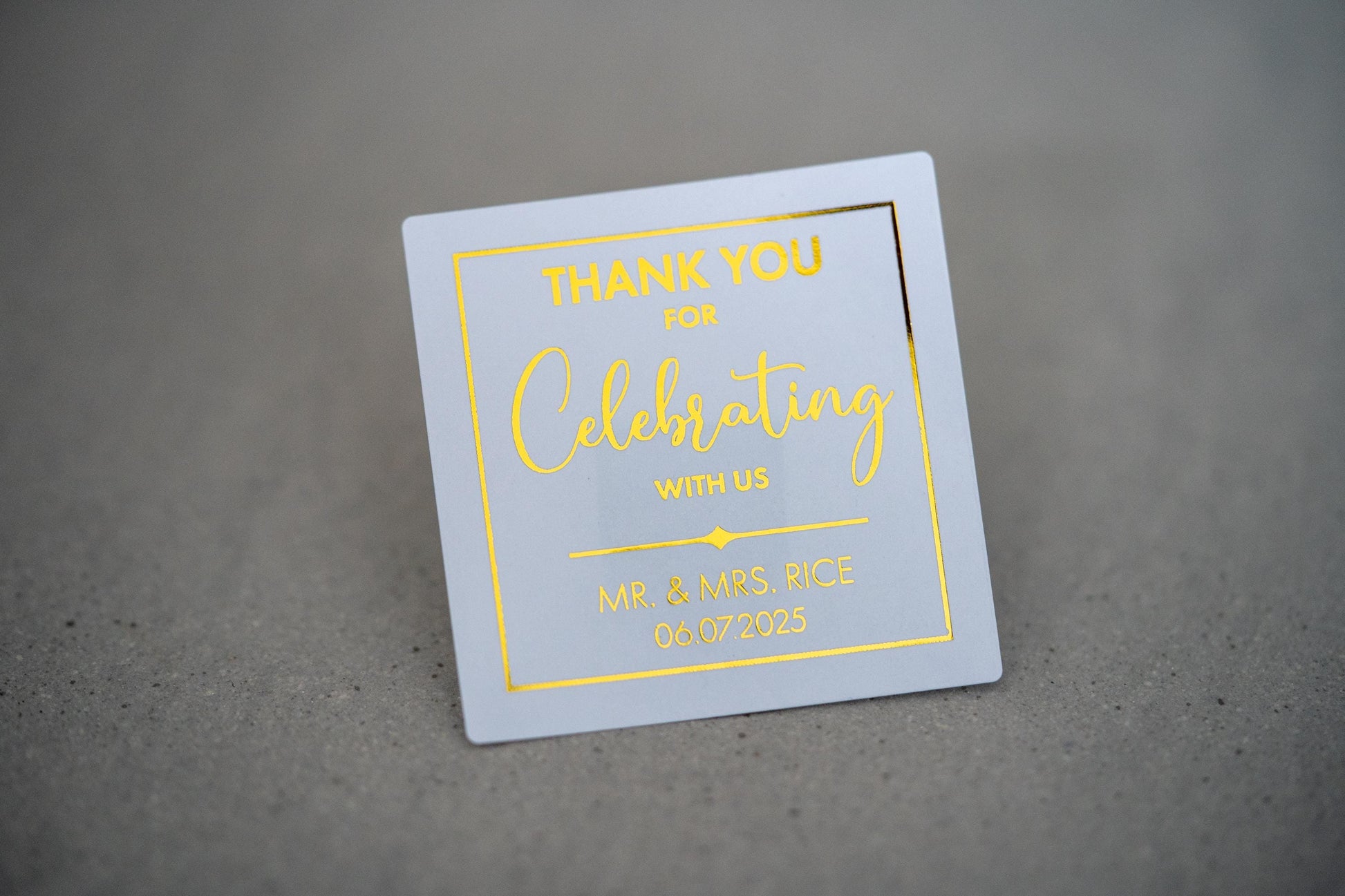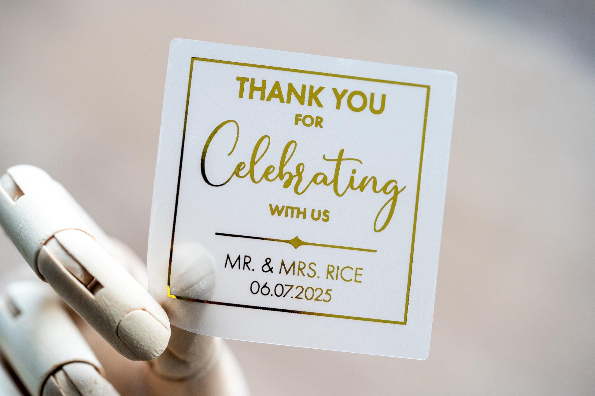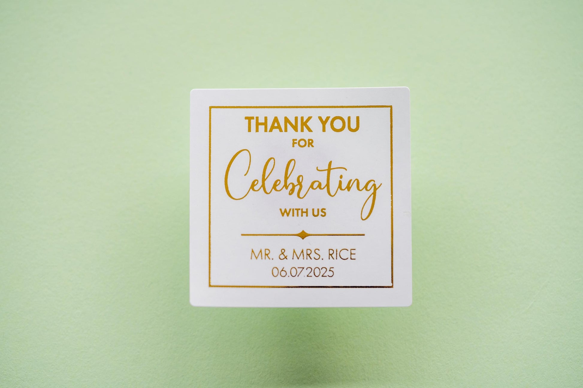 Celebrate life's precious moments with our Personalised "Thank you for celebrating with us" Stickers, adorned with exquisite Metallic Foil Print. Whether you're commemorating a graduation, engagement, or bridal shower, these stickers serve as a timeless memento for your guests to cherish. Add a touch of opulence to your favours and express gratitude in style with our premium stickers.