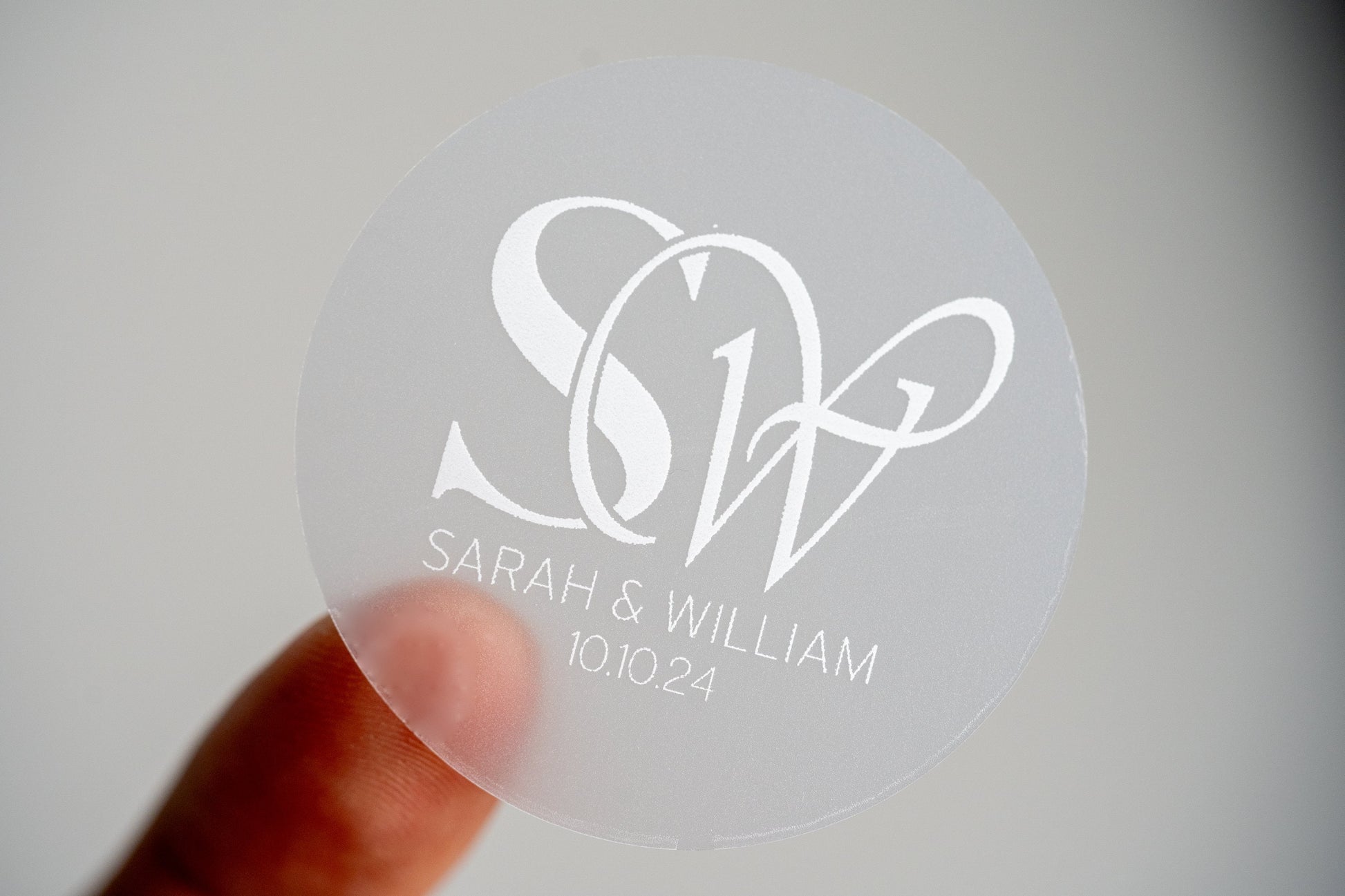 Add a touch of sophistication to your wedding favours, invitations or décor with this custom monogram wedding sticker. Printed on a sleek clear background with crisp white ink. This minimalist wedding sticker features your personalised initials, the names of the happy couple and the date of the special day displayed below. Perfect for modern or classic wedding themes, this chic wedding decal is a timeless keepsake. Ideal for sealing envelopes, decorating favours, or adding a stylish touch to any event. Order your custom wedding stickers today!